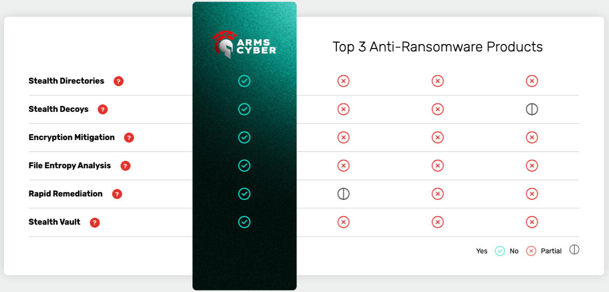 Arms Cyber identifies, neutralizes, and recovers from ransomware threats faster and more effectively than signature-based and behavioral methodologies.